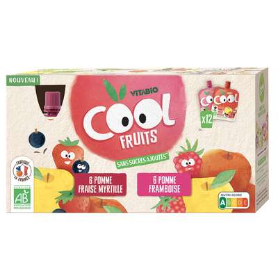 Vitabio COOL régale petits et grands avec le bon goût des fruits Bio ! Ces gourdes 100 % fruits, sans sucres ajoutés*, sont fabriquées en Nouvelle-Aquitaine à partir de pommes françaises. Ce pack biparfums de 12 gourdes met à l’honneur les fruits rouges, que les enfants adorent, avec 2 recettes : Pomme Framboise et Pomme Fraise Myrtille. Pratique à emporter, chaque gourde apporte 1 des 5 portions de fruits et légumes recommandées par jour, pour des goûters sains et gourmands.