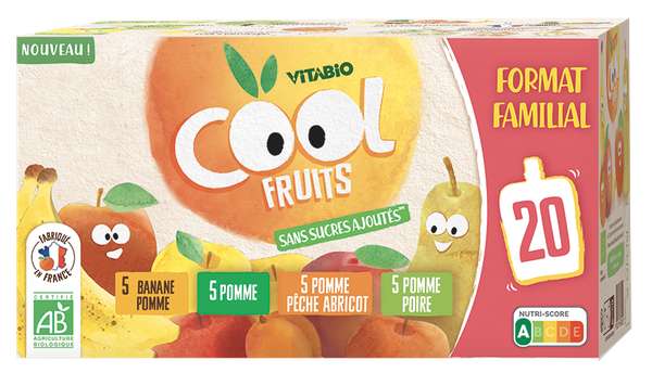 Vitabio COOL régale petits et grands avec le bon goût des fruits Bio ! Ces gourdes 100 % fruits, sans sucres ajoutés*, sont fabriquées en Nouvelle-Aquitaine à partir de pommes françaises. Ce pack familial multiparfums de 20 gourdes contient 4 recettes à partager pour toute la famille : Pomme, Pomme Poire, Pomme Pêche Abricot et Banane Pomme. Pratique à emporter, chaque gourde apporte 1 des 5 portions de fruits et légumes recommandées par jour, pour des goûters sains et gourmands.