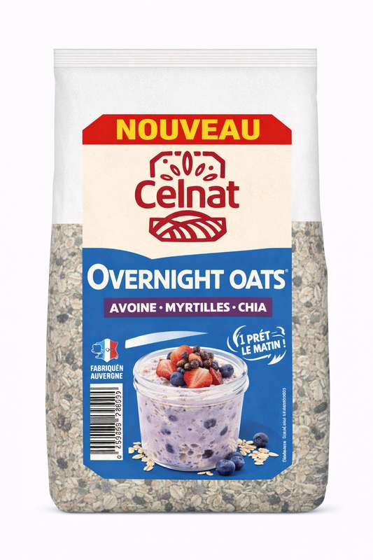 L’Overnight oats porridge myrtilles bio 300g de Celnat, préparation prête à l’emploi pour des petits-déjeuners fruités et équilibrés. Poids net : 300 g.