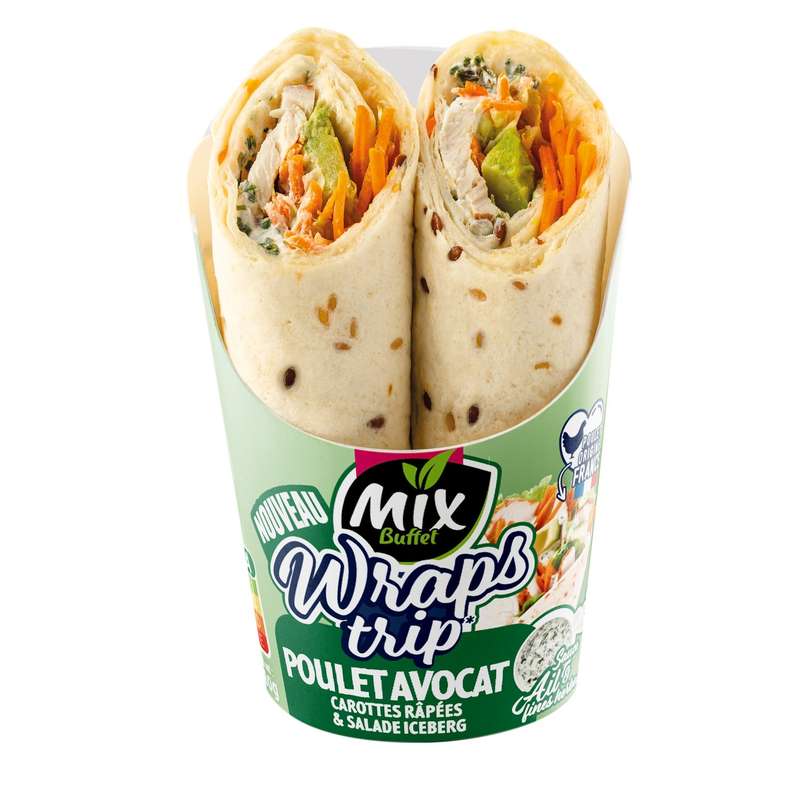 Galette de BLE aux graines de lin 49,4% (farine de BLE, eau, huile de colza, graines de lin 1,1%, poudres à lever : carbonate de sodium - diphosphates, dextrose, acidifiant : acide malique, sel, agent de traitement de la farine : L-cystéine), émincés de filet de poulet traité en salaison rôti 13,8% [filet de poulet 12,5% (origine : France), dextrose, fécule de manioc, sel], avocats 11,1%, FROMAGE salé (FROMAGE, sel), eau, laitue 3,9%, carottes 3,2%, ciboulette 1,2%, huile de colza, ail 1,1%, échalote 0,9%, persil 0,4%, amidon modifié, vinaigre d’alcool, jaune d’OEUF, MOUTARDE de Dijon (eau, graines de MOUTARDE, vinaigre d’alcool, sel), sel, épaississant : gomme xanthane.Traces éventuelles de crustacés, soja, poissons, fruits à coque, céleri, graines de sésame, mollusques et autres céréales contenant du gluten.