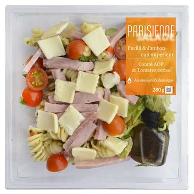 Salade composée 92,9% : Pâtes alimentaires fusilli cuites 43,8% (eau, semoule de BLÉ dur), salades mélangées 17,8% (laitue, chicorée et roquette), jambon blanc cuit supérieur 10,7% (jambon de porc 9,7% (origine : France), eau, sel, dextrose, arôme naturel, antioxydant : érythorbate de sodium, conservateur : nitrite de sodium), tomates cerise 7,1%, Comté AOP 5,3%, tomates mi-séchées marinées 3,1% (tomates, huile de tournesol, sel, plantes aromatiques), jeunes pousses d’épinard émincées, huile d’olive vierge extra, huile de colza, persil, sel.Vinaigrette au vinaigre balsamique 7,1% : Huile de colza, vinaigre balsamique 1,7% (vinaigre de vin, moût de raisin cuit, colorant : caramel E150d), huile d’olive vierge extra.Traces éventuelles d’oeuf.