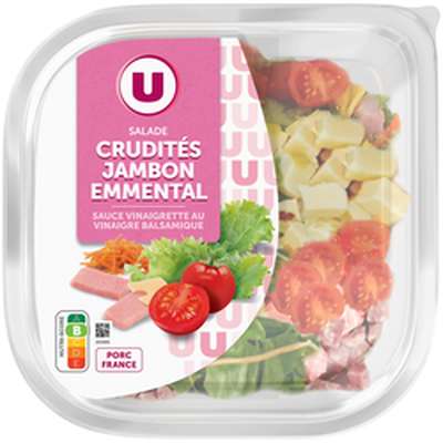 Salade composéE 225G : salades mélangées 46,6% (laitue, chicorée), tomates cerises 17,7%, jambon cuit supérieur 15,5% [jambon de porc 14,4% (origine : France), sel, dextrose, poudre de légumes déshydratés (blette, carotte), ferments lactiques], carottes 11,1%, EMMENTAL 8,8%. Pourcentages exprimés sur la salade composée. traces éventuelles de céleri, gluten, crustacés, poissons, fruits à coque, moutarde, graines de sésame, oeufs, soja et mollusques. Sauce vinaigrette au vinaigre balsamique 25g : huile de colza, vinaigre balsamique 30% [vinaigre de vin, moût de raisins concentré (contient SULFITES)], huile d olive vierge extra, MOUTARDE de dijon (eau, graines de MOUTARDE, vinaigre d alcool, sel), sel, poivre. Pourcentages exprimés sur la sauce vinaigrette au vinaigre balsamique origines : salades et EMMENTAL europe. Tomates cerises europe et/ou afrique*. Porc et carottes France. *selon les approvisionnements.