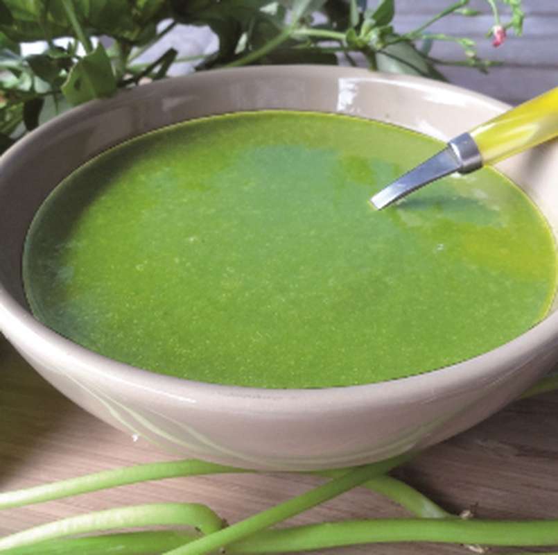 Une green soupe qui mélange poireau, courgette, et l'aliment bien-être en vogue - le chou kale - avec une pointe d'ail et de tahin (sésame) pour la relever.