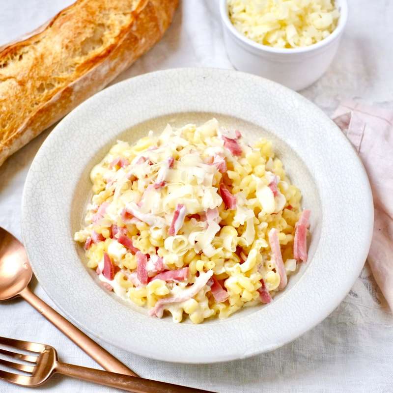 La même recette que les coquillettes à la crème de truffe mais sans la truffe : de l'excellent jambon Prince de Paris avec de l'emmental AOP et un peu de crème pour lier le tout.