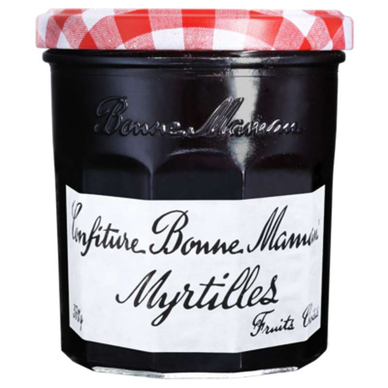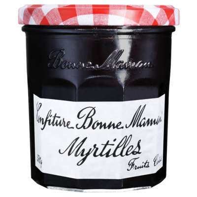 FRUITS : myrtilles, sucre, sucre roux de canne, jus de citrons concentré, gélifiant : pectine de fruits Préparée avec 50 g de fruits pour 100 g de produit fini Teneur totale en sucres : 60 g pour 100 g de produit fini