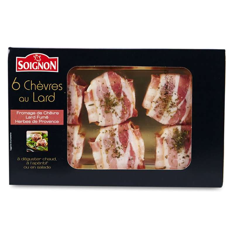 Fromage de chèvre (60%) : LAIT de chèvre pasteurisé, sel, conservateur : E202, ferments lactiques, coagulant, Lard fumé (39%) : viande de porc, sel, dextrose, sirop de glucose, sucre, lactose, épices, arôme, antioxygène (E301, E325, E331), exhausteur de goût (E621), conservateurs (E250, E252), correcteurs d?acidité (E262, E270), arôme de fumée. Herbes de Provence (1%)