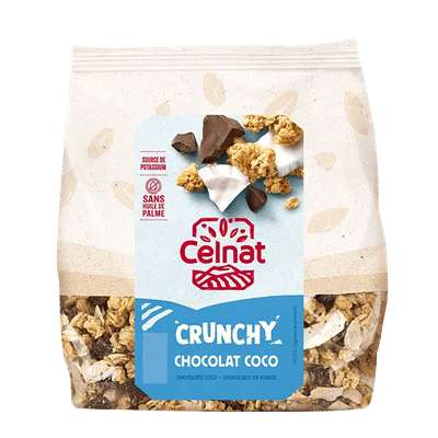 Notre crunchy chocolat coco est réalisé sans huile de palme, avec de délicieux copeaux de noix de coco et des carrés de chocolat 70% de cacao. Il est source de potassium.