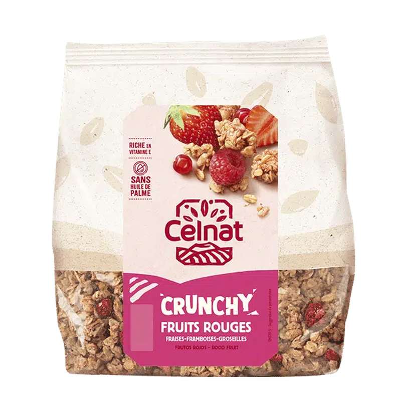 Ce crunchy fruits rouges est réalisé sans huile de palme. Il est riche en vitamine E.