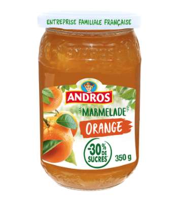 La meilleure chose qui puisse arriver à un fruit bien mûr ? C'est d'être sélectionné par ANDROS. Là, il a toutes les chances de se transformer en délicieuses confitures allégées à savourer sans se priver puisqu'elles contiennent 30% de sucre en moins qu'une confiture traditionnelle. ANDROS, La Force du Fruit !. Marmelade d'oranges allégée en sucres (30% de sucres en moins)