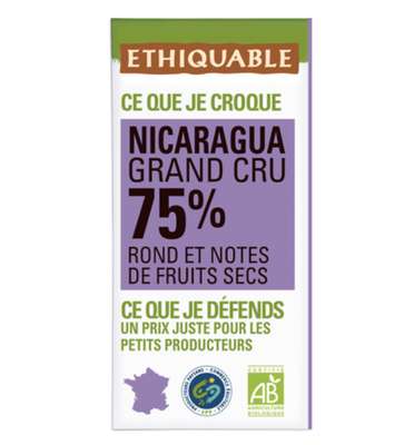 Chocolat noir issu du commerce équitable et de l’agriculture biologique.Pâte de cacao du Nicaragua 66%*, sucre de canne*, beurre de cacao*. Cacao : 75% minimum dans le chocolat.° issus de l'agriculture biologique (100%).* issus du commerce équitable (100% du poids total avec 65% SPP). Le symbole des producteurs paysans (SPP) garantit un commerce équitable exclusivement centré sur la petite agriculture paysanne. Il appartient aux producteurs du commerce équitable.PEUT CONTENIR DES TRACES DE FRUITS A COQUE, LAIT ET GLUTEN
