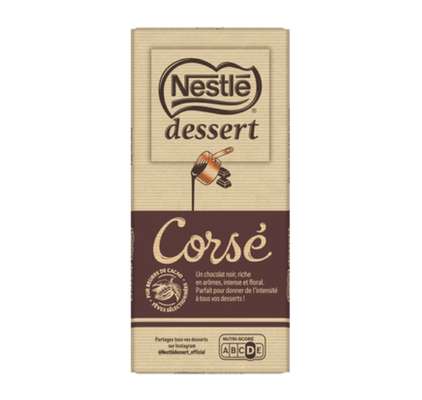 NESTLÉ DESSERT Corsé est un chocolat noir à 65% de cacao riche en arômes, intense et floral. C'est la tablette à pâtisser idéale pour donner de l'intensité à tous vos desserts ! Avec le Plan cacao, NESTLÉ DESSERT soutient les cultivateurs pour améliorer la qualité de leur cacao.