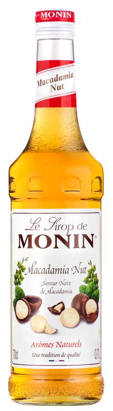 Sucre, eau, arôme naturel, acidifiant : acide citrique, colorant : E150a, conservateur : E202. Contient de l'extrait de noix de macadamia.