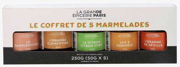 Afin de découvrir de nouveaux goûts, La Grande Épicerie de Paris a créé une sélection de cinq mini marmelades acidulées. Orange, trois agrumes, citron-citron vert, orange-clémentine et pamplemousse, une belle sélection pour satisfaire les palais. Elles peuvent être dégustées au petit déjeuner ou en collation.