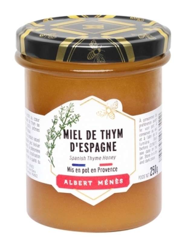 Le thym est une plante aromatique proche du Serpolet, avec un parfum plus accentué. Il pousse dans les collines ensoleillées et donne des miellées quand les conditions météorologiques sont favorables, notamment après les pluies et surtout en absence de vent. Avec un sol sec et rocailleux, l'Espagne offre un terrain idéal et la miellée, qui a lieu après celle du romarin, exhale une saveur parfumée agréable, ainsi qu'une odeur caractéristique de la flore méditerranéenne avec des notes balsamiques. Très recherché pour son goût, le miel de thym Albert Ménès a la particularité de se voir prêter des vertus désinfectantes. Ce serait un antiseptique reconnu. Autant d'atouts qui contribuent à faire de ce miel un produit d'exception.