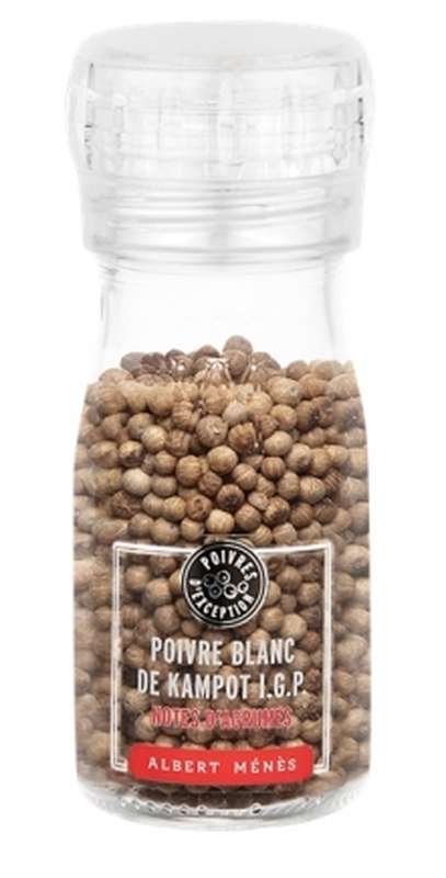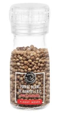 Un vrai trésor pour les amateurs de produits d'exception. Un moulin à poivre qui renferme du poivre blanc de Kampot, l'un des poivres les plus rares au monde. Ce poivre unique est cultivé depuis le 12e siècle au Cambodge et c'est un poivre d'exception au caractère subtil. Il dévoile des notes fruitées d'agrumes et des notes fraîches, ce qui en fait un favori des grands chefs. Il sera idéal avec du poisson ou infusé dans des bouillons et consommés.