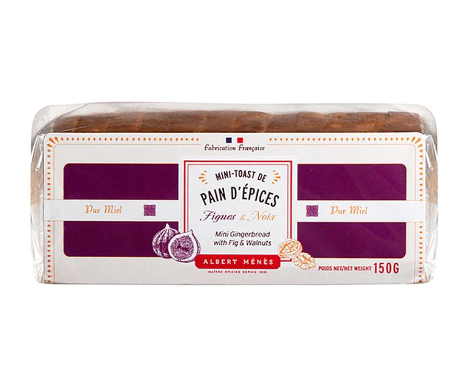 Le mini pain d'épices aux figues et aux noix Albert Ménès est élaboré à partir de matières premières nobles telles que la farine de seigle et le miel. Son procédé de fabrication respecte scrupuleusement la recette traditionnelle : la première opération consiste à malaxer la farine de seigle avec du miel tiède jusqu'à l'obtention d'une pâte colorée appelée la "pâte mère". Cette pâte repose au moins un mois afin de lever et de s'aérer. Passé ce délai, elle est à nouveau malaxée dans un pétrin avec du miel, de petits morceaux de noix croquantes, des figues séchées tendres et parfumées et de la levure. L'opération est menée rapidement pour que la pâte ne chauffe pas. Elle est ensuite coulée dans de grands moules rectangulaires pour la cuisson. Après refroidissement, les pains sont tranchés et prêts à être dégustés. Cette recette est l'une des rares à n'utiliser que le miel comme produit sucrant, d'où son appellation "pur miel".