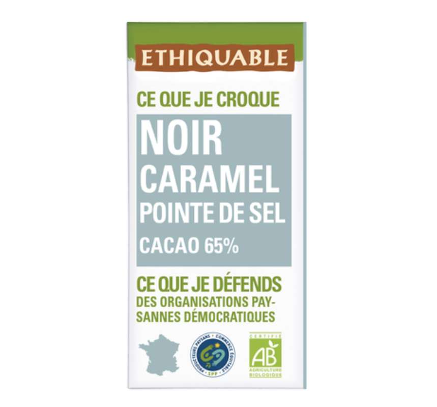 "Pâte de cacao* de Côte d'Ivoire et d'Equateur 50%, sucre de canne*, éclats de fèves de cacao* 10%, beurre de cacao*, émulsifiant: lécithine de SOJA (non OGM). Cacao : 63% minimum * issus du commerce équitable et de l'agriculture biologique (99,5% du poids total)"
