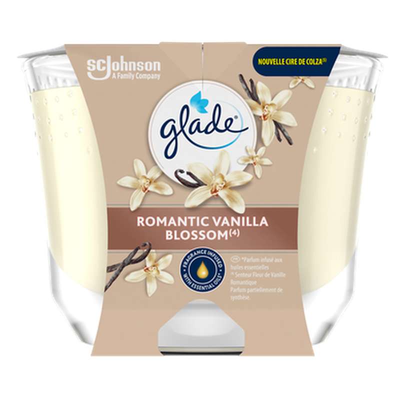 Parfumez délicatement toutes les pièces de votre maison lorsque vous le souhaitez et vivez une expérience olfactive inoubliable grâce aux bougies Glade®. Nos bougies Glade® sont formulées à partir de cire végétale et leur parfum est soigneusement élaboré par des maîtres parfumeurs pour vous proposer un moment intense et envoûtant. Elles se fondent impeccablement dans votre maison pour devenir un véritable objet de décoration intérieure. Toutes nos bougies sont certifiées Vegan. Créez une atmosphère tendre et sereine avec le parfum Romantic Vanilla Blossom aux notes de vanille, orchidée blanche et bois de santal se mêlant amoureusement pour former un parfum délicat élaboré avec soin.