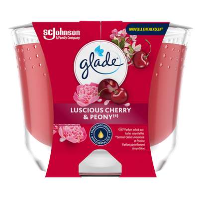 Parfumez délicatement toutes les pièces de votre maison lorsque vous le souhaitez et vivez une expérience olfactive inoubliable grâce aux bougies Glade®. Nos bougies Glade® sont formulées à partir de cire végétale et leur parfum est soigneusement élaboré par des maîtres parfumeurs pour vous proposer un moment intense et envoûtant. Elles se fondent impeccablement dans votre maison pour devenir un véritable objet de décoration intérieure. Toutes nos bougies sont certifiées Vegan. Créez une ambiance absolument réconfortante grâce au parfum Luscious Cherry & Peony, savant mélange de notes sucrées de cerise et de fruits rouges mélangées aux notes florales de la pivoine et de la rose légèrement relevées par le caractère du bois blanc.
