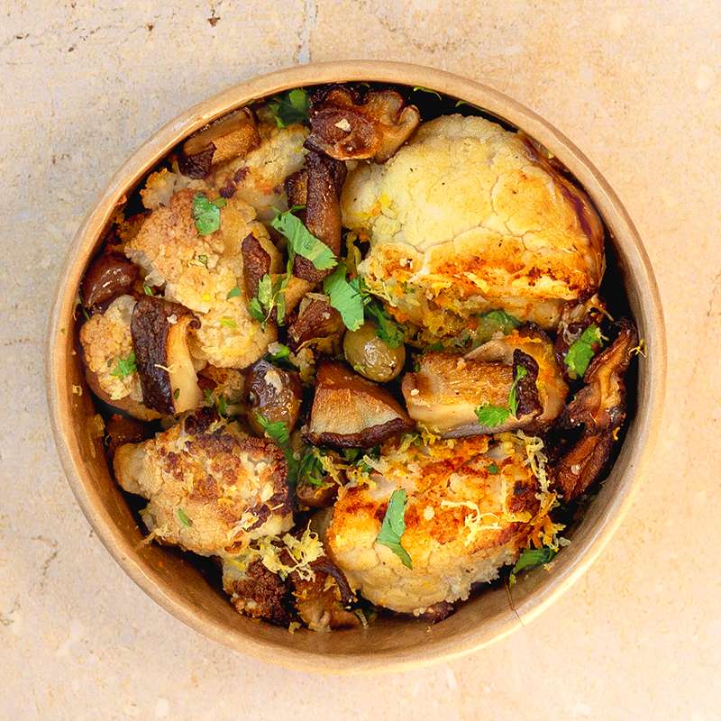 Une délicieuse recette de chou-fleur rôti Ottolenghi style aux épices paprika, accompagné de shiitake, d'olives taggiash et relevé par des zestes de citron et d'orange.