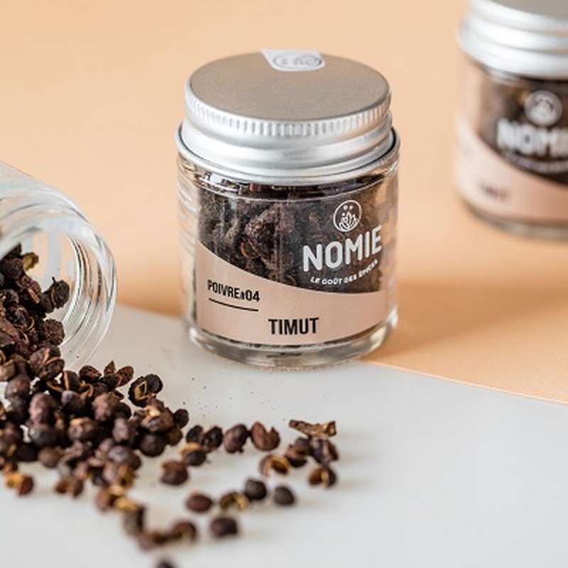 La baie de Timut ressemble à des grains de poivre aux arômes intenses de pamplemousse et d’herbes séchées. Cette baie ne pique ni ne brûle comme le pourrait un poivre, mais elle laisse un léger picotement voire un effet subtilement anesthésiant sur le bout de la langue. Récolté au Népal dans la région de Katmandou, ce « faux poivre » est un cousin de la baie de Sichuan que l’on trouve en Chine, ou également du sansho japonais et coréen.