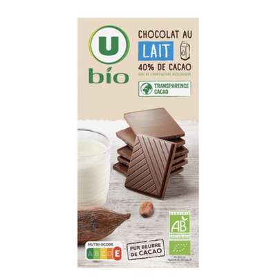 Sucre de canne*, LAIT entier en poudre* 24,8%, beurre de cacao* 1, pâte de cacao*1, émulsifiant : lécithines de tournesol*, extrait de vanille*. Cacao : 40% minimum. *ingrédient issu de l'agriculture biologique. 1 fèves de cacao provenant du programme transparence cacao. Traces éventuelles de fruits à coque et céréales contenant du gluten.