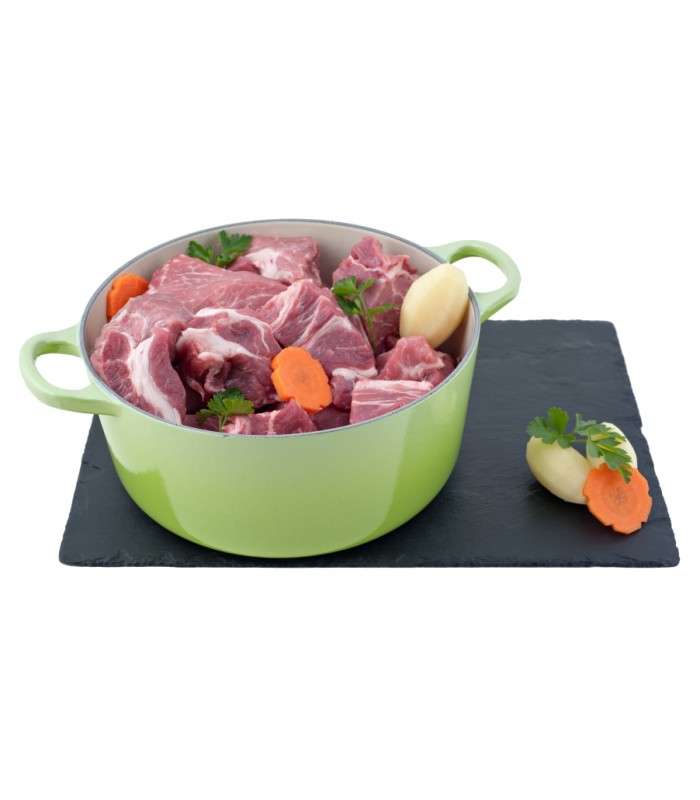 "Navarin d'agneau sans os, à faire mijoter avec des carottes, navets et autres légumes.