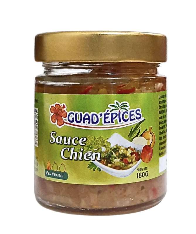 Le nom étonnant de cette sauce, provient du couteau avec lequel, traditionnellement, on coupait les épices la préparer. Un couteau de la marque «Chien», reconnaissable au symbole figurant sur sa lame. Cet incontournable de la cuisine antillaise se présente comme une vinaigrette créole et légèrement pimentée.