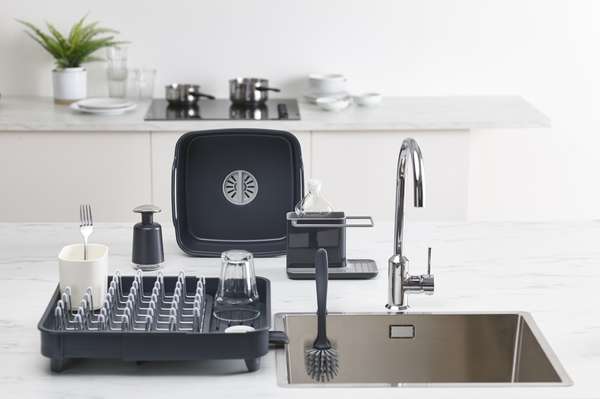 Un dispositif intégré peut être réglé pour retenir l'eau afin de la vider plus tard. Les bords surélevés empêchent l'eau de stagner sous les verres et les bols et la base inclinée canalise l'eau vers le bec d'évacuation. Les pointes d'évacuation ne s'égratignent pas et peuvent être facilement retirées pour le nettoyage.