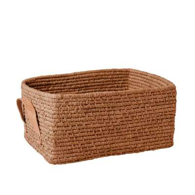 Magnifique panier de rangement rectangulaire en raphia, coloris thé, avec des poignées en cuir qui lui donne un charme très élégant. Ce panier de rangement est fabriqué à Madagascar – dans une conscience éthique et avec beaucoup d’amour. Ces dimensions (H 16 x l 34 x P 23 cm) sont idéales pour ranger tout ce qui traîne.