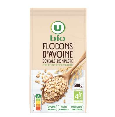 Flocons d'AVOINE complète*. *ingrédient issu de l'agriculture biologique Traces éventuelles de soja, lait et fruits à coque. Origine : avoine France