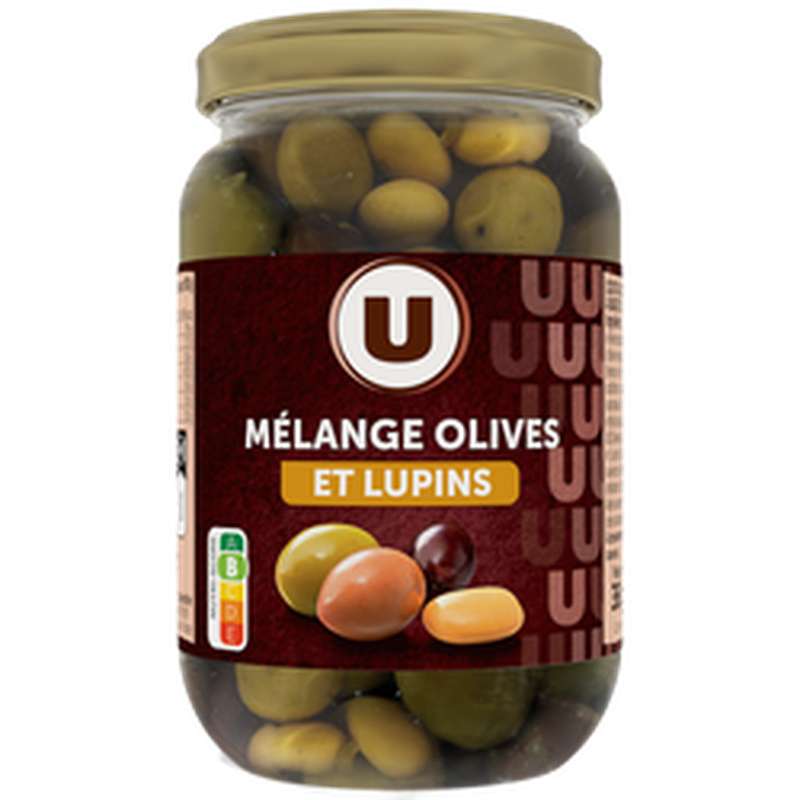 lupins, Traces éventuelles de poisson, sulfites et fruits à coque. Origines : Olives Espagne, Grèce, Maroc. Lupins Espagne.