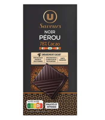 Pâte de cacao* (origine Pérou), sucre, beurre de cacao. Cacao: 78% minimum. Traces éventuelles de fruits à coque, de céréales contenant du gluten et de lait. * fèves de cacao provenant du programme transparence cacao