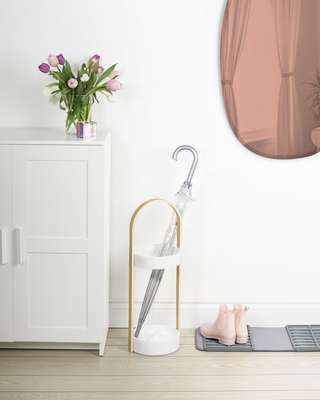 Le porte-parapluie Bellwood est durable et élégant grâce à sa belle forme et sa base en résine, anti-rouille et waterproof. Comprend une base ronde et une poignée en bois courbé et plaqué avec un anneau supérieur en acier. Cette accessoire est facile à assembler et livré avec toute la visserie. Ses fentes maintiendront facilement vos grands parapluies et ses petits crochets sur le dessus de l'anneau accueilleront parfaitement vos parapluies courts et plus compacts. 22,2 dia x 68,6 cm, ce porte parapluie élégant s'intégrera parfaitement dans de nombreux espaces et styles de décoration.