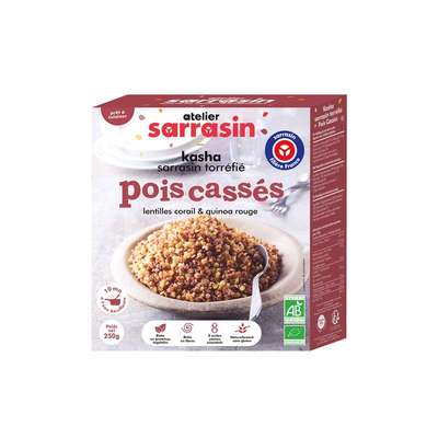 Ingrédients : sarrasin grillé* 50 %, lentille corail*20 %, quinoa rouge* 15%, pois cassés