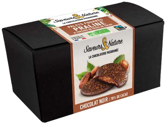 Ballotin palets de chocolat noir cœur praliné et copeaux de fèves de cacao BIO, Saveurs & Nature (125 g)