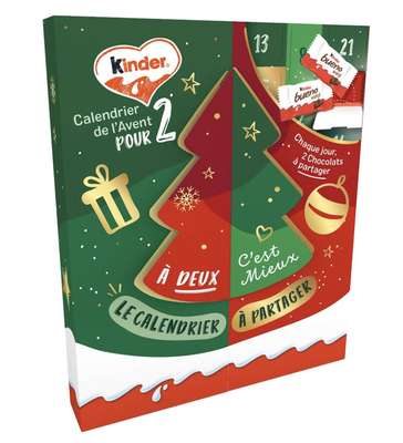 Le premier calendrier à partager ! Grâce à ses 2 chocolats dans chaque fenêtre, ce sera le partenaire idéal pour patienter à deux jusqu'à Noël. En couple, entre frère/sœur ou entre amis, à chaque jour une des meilleures recettes Kinder à savourer en duo.