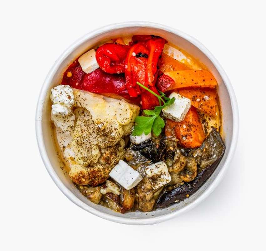 chou fleur rôti 20% (chou fleur, huile d'olive extra, sel), patate douce 20% (patate douce, huile d'olive extra, sel), aubergine rôtie 20% (aubergine, huile d'olive extra, sel), poivron grillé 20%, FETA 18% (LAIT de brebis et de chèvre pasteurisé, ferments lactiques, sel, coagulant), miel, ZAATAR , persil