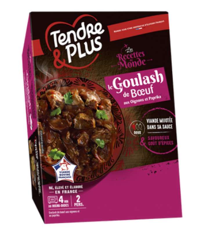 viande bovine origine France 64%, eau, oignons déshydratée 3,8%, extrait de champignon de Paris, maltodextrine, amidon, sel, épices (dont paprika 0,37%), arômes naturels, ail, farine de riz, fécule de pomme de terre, dextrose, graisse de bœuf, fibre végétale.