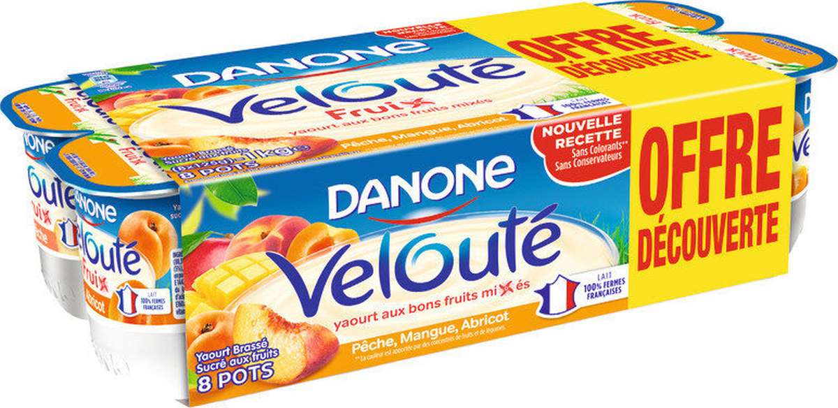 Yaourt (lait) (84,6%), sucre (8,2% en moyenne), fruits (5%) (abricot ou mangue ou pêche), épaississant (amidon transformé de mais), concentrés de carotte et de pomme (dans variétés abricot et pêche), concentré de carotte et de citrouille (dans variété mangue), correcteurs d'acidité (citrate de sodium, acide citrique), arômes. Lait:Origine France DANONE