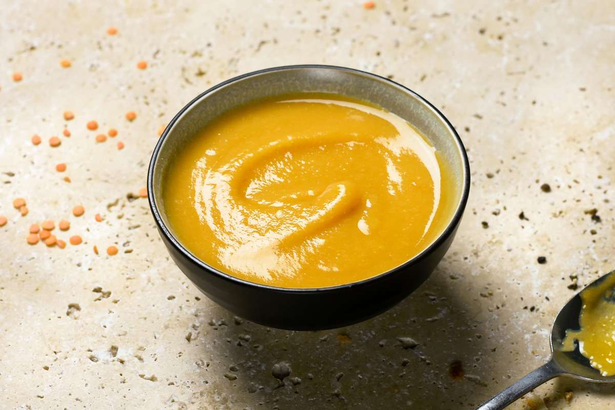 Une soupe texturée mais surtout parfumée par les lentilles corail et relevées d'une pointe de curry vert.