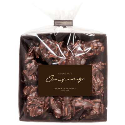 Ces éclats d'amandes enrobés de chocolat noir sont une délicieuse création de la Confiserie Imping, ravissant les amateurs de douceurs.