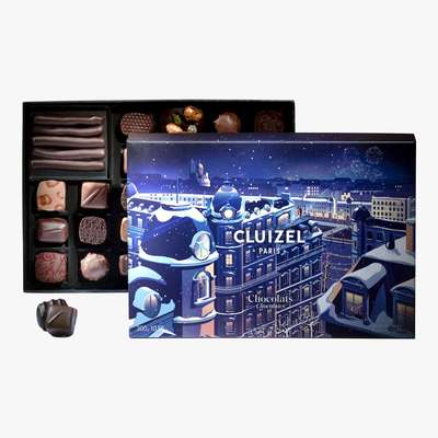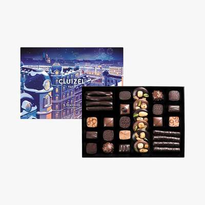 Un assortiment de chocolats fins comprenant ganaches, pralinés et mendiants, parfait pour partager lors des fêtes.