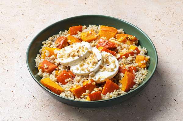 Voilà un plat qui fait du bien ! Des potimarrons rôtis avec amour, de belles tranches de chèvre Sainte-Maure et des noisettes concassées pour le croquant, sur un lit de boulghour et de quinoa. \n\nCe plat fait partie de notre gamme Équilibre ! Ça veut dire qu’il respecte les calories et les proportions recommandées par les nutritionnistes : 50% de légumes & 50% de féculents complets dont protéines.