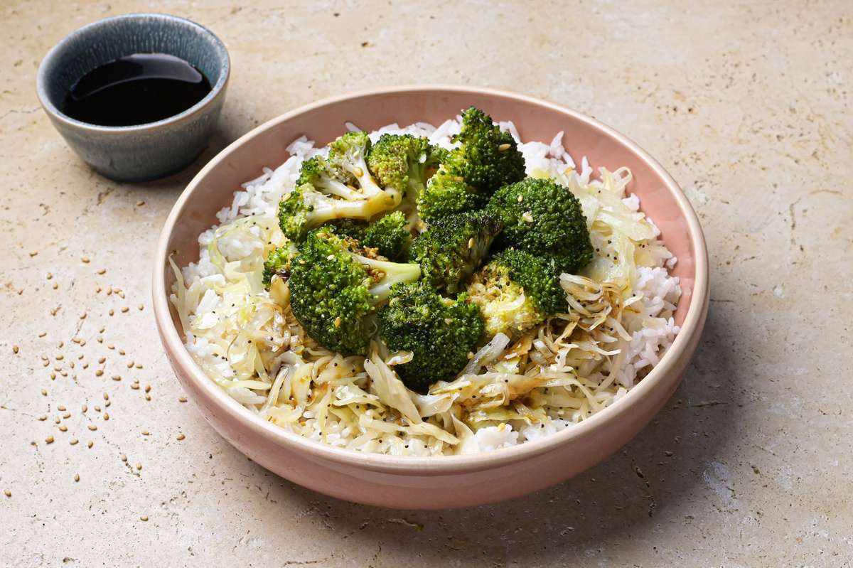 Un bol coloré de riz vinaigré avec chou blanc mariné à la japonaise, des brocolis encore croquants et de la sauce soja sucrée !