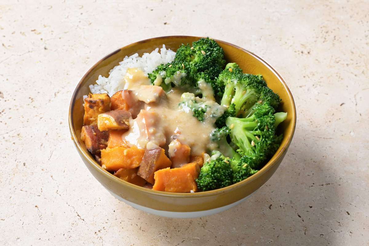 Un bowl veggie avec du riz tendre, des patates douces rôties, des brocolis croquants et surtout une sauce onctueuse avec du miso — une pâte de soja au goût entêtant — et de la cacahuète.