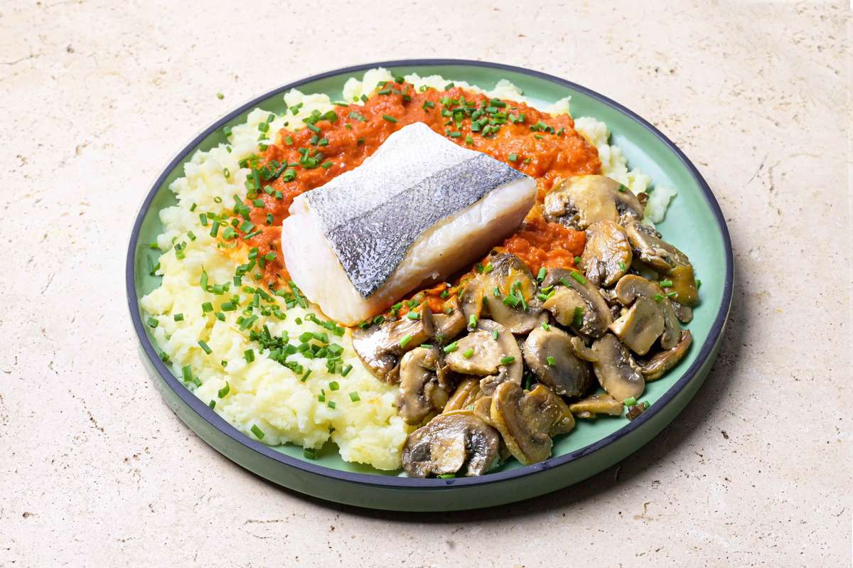 Un pavé de merlu extra frais accompagné d'un écrasé de pomme de terre et d'une poelée de champignons de paris, ce plat est une véritable tuerie !