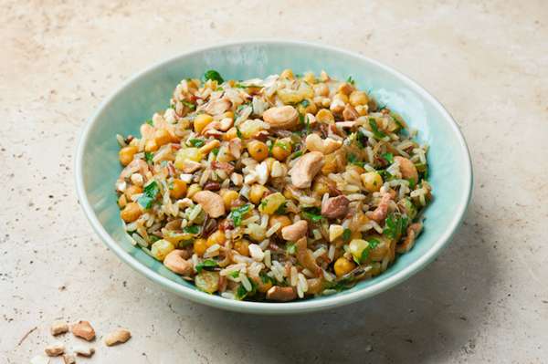 Gourmand vous avez dit gourmand ? Goutez à un doux mélange de riz sauvage-pois chiche-raisin blond légèrement relevé de cannelle, curry et chilli powder. Miam