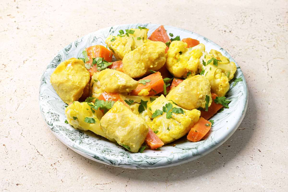 Mélange Carotte (Carotte, chou fleur, marinade (Huile de grignon d'olive, sauce soja salée sans gluten, vinaigre de cidre, sucre, ail, Nuoc mâm, gingembre, curcuma), coriandre, curcuma, sel), Poulet (Sauté de poulet Bleu Blanc Coeur origine France, marinade (Huile de grignon d'olive, sauce soja salée sans gluten, vinaigre de cidre, sucre, ail, Nuoc mâm, gingembre, curcuma), citron jaune Bio, Thym), Sauce (Jus de légume (Carotte, chou fleur, marinade (Huile de grignon d'olive, sauce soja salée sans gluten, vinaigre de cidre, sucre, ail, Nuoc mâm, gingembre, curcuma), coriandre, curcuma, sel)