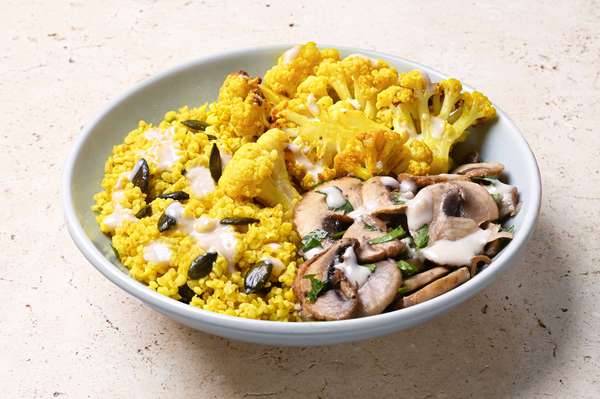 Un joli bowl vegan coloré avec des choux-fleurs rôtis, un boulghour au curcuma, des champignons de paris et une sauce tahini bien rafraîchissante.